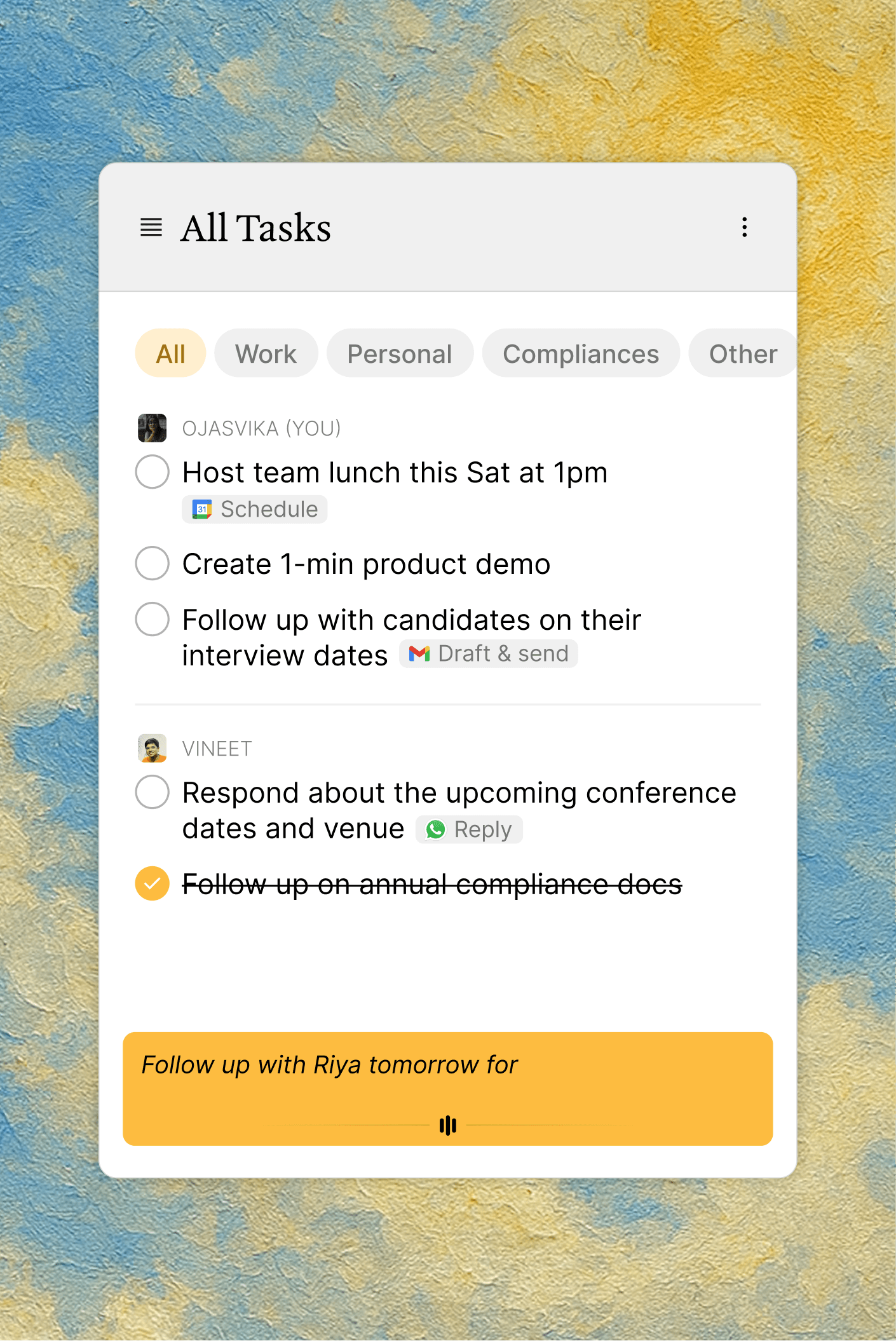 Shram watches your activity across all communication apps. It detects when someone needs a response, a check-in, or a meeting to be set up.